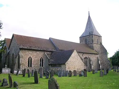The building is of sandstone from the Tunbridge Wells Sand Formation.[3] It has a tiled roof and consists of a nave with a south aisle and porch, a chancel with a south chapel and a vestry to the north. The 13th century west tower has a Broach spire, supported by buttresses, and a clock face with a single hour hand.[1] The tower contains eight bells with the largest tenor bell weighing 714 kilograms (1,574 lb).[5] The bells and frame was cast and installed by Gillett & Johnston in 1911.[6]