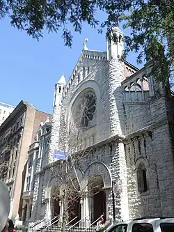 The elaborate midblock church, located on 107th Street between Amsterdam Avenue and Broadway, has an attached parish house, both designed in the Sicilian Romanesque of the Norman and Byzantine hybrid style and built between 1896 and 1897 to the designs by the German—American Catholic church-building architectural firm of Schickel & Ditmars.[1] The parish has a four-storey brick and stone parochial school built by P. J. Brennan & Son, builders, in 1911 to designs by architect F. A. de Meuron of 31 East 27th Street for $120,000.[2] A five-storey brick dwelling house was erected at 218 West 108th Street in 1927 to the designs by architect Robert J. Reilly of 12 E 41st Street for $100,000.[2] The church was renovated in 1939.[1]