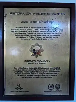 Known for its architectural design and the works of five national artists,[2] the church is recognized as a National Historical Landmark and a Cultural Treasure by the National Historical Commission of the Philippines, and the National Museum of the Philippines respectively. It was designed by the late National Artist of the Philippines for Architecture, Leandro Locsin, one of four National Artists who collaborated on the project. Alfredo Juinio served as the structural engineer for the project.