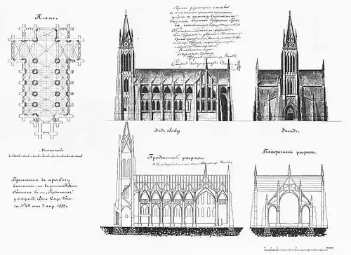 The Church of the Holy Trinity is a typical example of the Neogothic style. Its height is 61 meter, and it's one of the tallest churches in Belarus.[1] The temple has three naves and a small transept, the naves are separated from each other by two rows of five columns each. There is no apse behind the presbytery. A characteristic element of the architecture of the temple are multi-stage buttresses, turning into flying buttresses. The walls of the temple are cut through with narrow lancet window openings in niches.[9]