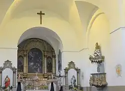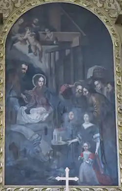 The main altarpiece from the first half of the 18th century represents the birth of Jesus Christ in Bethlehem. In the lower-right corner there is the portrait of the founder Count Louis Colloredo holding a model of the church, his wife Maria Eleonora and their daughter Maria Antonia.[3] The wooden pulpit was also made the first half of the 18th century. On the top there is a statue of Moses.