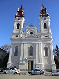 After the demolition of an old church near the Mureș River, a new one was begun upon the initiative of Prokopije Ivačković, the Bishop of Arad. Construction lasted from 1862 to 1865, receiving funds from the Mocioni family and from Viennese banker Simon Sinas. Anton Czigler, a native of Gyula, was the architect. After its dedication, the building served as the diocesan cathedral.[1]