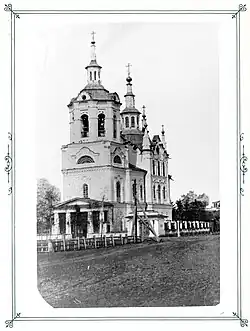 The first reliable account of the Tyumen Church of the Saviour comes from the 1624 Dozornaya book, which describes a wooden, "cold" All-Merciful Church in a posad.[5] It was located on the Market (Guest) square, near the walls of the Tyumen Kremlin.[6] Local historian Aleksandr Ivanenko assumes that it was named after the Spasskaya gate tower of the Kremlin,[3] from which started the Large Spasskaya Street (now the Republic Street).[7] According to Ivanenko, the church was located a bit to the left of a house at the Republic Street; that place is now swamped by the Tura River.[3]