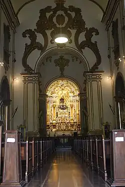 Inside, the transept area has an octagonal dome decorated with 18th century paintings and openings for abundant light, an altar dedicated to Saint Michael and another remarkable altarpiece dedicated to Immaculate Conception, made between 1736 and 1740 by the carver Luís Rodrigues Lisboa. The latter, an erudite carving in the Johannine style, has Atlantean angels supporting Solomonic columns, a novelty in São Paulo at the time. It also features other characteristics of the style, such as angels seated on volutes and a stepped throne under a sculptural ensemble of Saint Francis receiving the wounds, which was moved to the new main altarpiece, made in the Rococo style by José de Oliveira Fernandes in 1791, during the renovation at the end of the 18th century.[10][11]