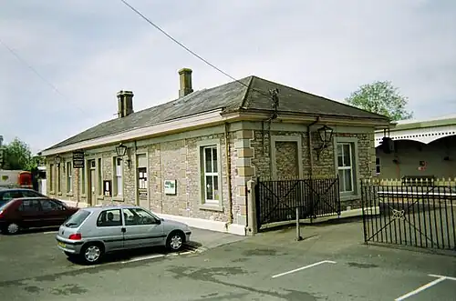 The main entrance is onto the platform mainly used by trains towards Kingswear. Signalling allows trains to use this in both directions but in practice trains towards Paignton depart from the opposite platform, which is reached by a footbridge. The station buildings are built of solid masonry with a large canopy integral with the roof. The local paper described them on the opening day "as unarchitectural as any Goth could wish".[9]
