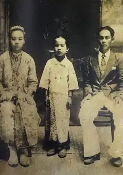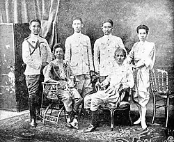 From the 1860s onward, Thai royals "selectively adopted Victorian corporeal and sartorial etiquette to fashion modern personas that were publicized domestically and internationally by means of mechanically reproduced images."[3] Stitched clothing, including court attire and ceremonial uniforms, were invented during the reign of King Chulalongkorn.[3] Western forms of dress became popular among urbanites in Bangkok during this period.[3] During the early–1900s, King Chulalongkorn encouraged Thai women to wear long hair instead of traditional short hair which later became a trend during the reign of King Vajiravudh along with wearing pha sin (ผ้าซิ่น), a tubular skirt, instead of the chong kraben (โจงกระเบน), a cloth wrap.[5]