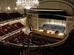"The orchestra is German; the music three-fourths German, and the other fourth exotic; scarcely half the singers were native-born; but, despite all this, it is thoroughly American, for nothing but that attenuated and intensified form of Anglo-Saxon called the Yankee could ever have supplied the nerve-force needed to carry on such a mammoth affair."[9] Performances included repertoire that was overwhelmingly German. Handel, Bach, Beethoven, Haydn, and Mozart comprised the first two concerts. Of the sixty works on the seven concerts, only five were by composers not born in a German-speaking country. The matinee concerts consisted largely of arias, art songs, and light orchestral works, including isolated movements of symphonies, Strauss waltzes, and overtures. Thomas's evening concerts were more formal and consisted of major vocal and choral works, including Handel's Dettingen Te Deum, scenes from Gluck's Orfeo ed Euridice, and Beethoven's Ninth Symphony, along with purely symphonic works and concert arias.[10]