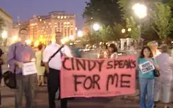 Cindy Lee Sheehan (née Miller; born July 10, 1957) is an American anti-war activist,[1][2] whose son, U.S. Army Specialist Casey Sheehan, was killed by enemy action during the Iraq War. She attracted national and international media attention in August 2005 for her extended antiwar protest at a makeshift camp outside President George W. Bush's Texas ranch—a stand that drew both passionate support and criticism. Sheehan ran unsuccessfully for Congress in 2008. She was a vocal critic of President Barack Obama's foreign policy. Her memoir, Peace Mom: A Mother's Journey Through Heartache to Activism, was published in 2006. In an interview with The Daily Beast in 2017, Sheehan continued to hold her critical views towards George W. Bush, while also criticizing the militarism of Donald Trump.[3]