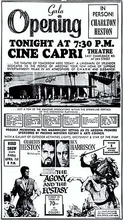 The Cine Capri opened with the Charlton Heston film The Agony and the Ecstasy.[2] On March 31, 1966, Charlton Heston hosted a youth drama clinic in the theater auditorium for several dozen high school and college students. This was followed by an afternoon “show & tell” reception for distinguished guests to personally meet Mr. Heston. Attendees included community leaders, city and state officials, the press, radio and television personnel, studio and distribution executives, and neighborhood merchants. Also there were the architects, contractors, members of the trade and craft suppliers, the Phoenix Art Council and the Mid Town Rotary Club, the sponsors of the evening charity program. Later Heston officially launched the theater with a ribbon cutting ceremony.