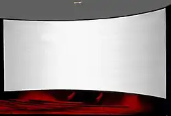 The Cinerama projection screen, rather than being a continuous surface like most screens, is made of hundreds of individual vertical strips of standard perforated screen material, each about 7⁄8 inch (~22 millimeters) wide, with each strip angled to face the audience, to prevent light scattered from one end of the deeply curved screen from reflecting across the screen and washing out the image on the opposite end.[4] The display is accompanied by a high-quality, seven-track discrete, directional, surround-sound system.