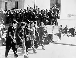 On 26 July 1943, the day after the fall of the Fascist regime, he staged a demonstration in Borgosesia and took direction of the anti-fascist movement in the Valsesia, restoring contacts with other anti-fascists and especially with Secchia.[36][37][38] After the proclamation of Armistice of Cassibile on 8 September 1943, he was among the promoters of the Valsesian Committee of Resistance (which later became the local Committee for National Liberation), which started organizing disbanded soldiers and anti-fascists into armed partisan groups.[39][40][41] Arrested on 29 October by the Carabinieri at the request of the German command of Vercelli, he was promptly freed by his comrades and by citizens who attacked the barracks. He then took refuge on Monte Briasco, where along with Eraldo Gastone (nom de guerre "Ciro", while Moscatelli became known as "Cino") he organized guerrilla actions with the "Gramsci" partisan group, which started its first clashes against the Germans and Fascists in December 1943.[42][43][44] The number of followers of Ciro and Cino quickly grew, and the "Gramsci" group soon became the 6th Garibaldi Brigade, active in the Valsesia.[45][46]