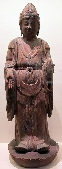 In Buddhism, the wish fulfilling jewel (Skt. maṇi, cintā-maṇi, cintāmaṇi-ratna) is an important mythic symbol indicating a magical jewel that manifests one's wishes, including the curing of disease, purification of water, granting clothing, food, treasure etc. It is a common symbol for the teachings and qualities of the Buddha.[6]