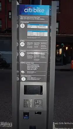 Initially, both daily and weekday passes were sold at Citi Bike docking stations.[19] As of July 2025, Citi Bike a day pass, costing $25 and allows unlimited 30 minute rides, and a single ride pass for $4.99, also limited to 30 minutes.[170] For every minute past the 30 minute limit, riders are charged $0.38/min for every minute thereafter.[170] The 8.875% New York State sales tax is added to the cost of all passes.[164] Day pass users pay an additional fee if they upgrade to an electric bike.[172]