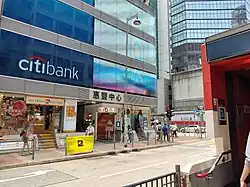Citibank (Hong Kong) Limited (Chinese: 花旗銀行; Cantonese Yale: Fākèih Ngàhnhòhng; formerly 萬國寶通銀行; Maahngwok Bóutūng Ngàhnhòhng) is the division of Citigroup that operates in Hong Kong Island, Kowloon and New Territories. It has 15 branches for operating retail banking. Citibank (Hong Kong)'s address of the principal place of business is Citi Tower, One Bay East, No. 83 Hoi Bun Road, Kwun Tong, Kowloon.[2] However, Citibank, N.A. Hong Kong branch office is located on the 50th floor of Champion Tower, 3 Garden Road, Central, Hong Kong which doesn't operate retail banking.[4]