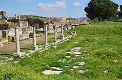 For the first period, several fairly general trends were identified that determined the appearance of the city. First, after more than a century and a half, the construction of city walls resumed at the end of the 5th century. The previous fortification program, which began under Emperor Valerian I in the middle of the 3rd century in response to the invasions of the Goths and Heruli, ended around 330. As a rule, the early Byzantine walls of the cities of Asia Minor and the Balkans date from the reign of the emperors Anastasius I (491–518) and Justinian I (527–565), however, the absence of a real military threat in those years makes the dating unreliable. In modern works, it is suggested that the walls of a number of Asia Minor cities could have been created during the era of Theodosius dynasty (379–450), when the empire was threatened by the Goths and Huns. The Theodosian walls were impressive structures that surrounded almost entirely residential areas and were equipped with representative gates. According to one point of view, the walls marked the core of the city and served as a symbol of its status.[3][4] On the contrary, the perimeter of the walls built under Justinian and his successors, as a rule, did not allow to protect the entire city.[a] In favor of short walls, a choice was made in the new fortresses erected after the conquest of North Africa.[6] The small size of the inner city did not necessarily indicate a population decline, since most of the population lived outside of it.[3]