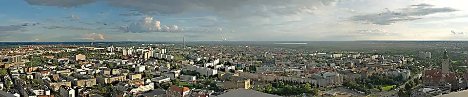 City-Hochhaus was originally part of the University of Leipzig campus at Augustusplatz, was sold by the state government of Saxony and is now owned by the U.S. investment bank Merrill Lynch.[5] The building was completely renovated between 1999 and 2002, when it lost its aluminium sheathing which was replaced by grey granite. The offices are now rented to private tenants, including the public broadcaster MDR, the European Energy Exchange[6] and a restaurant called 'Panorama'. The roof is equipped with a viewing platform.