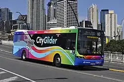 CityGlider is a brand name applied to a pair of high-frequency bus routes operated by Transport for Brisbane in Brisbane, Australia. Bus stops serviced by the CityGlider services are identified with signs and painted kerb. Both operate 24 hours a day on Fridays and Saturdays.[1] Both are operated by dedicated fleets of buses vinyled in either blue or maroon liveries with a gliding possum motif, which was originally illustrated by Anya Lange.