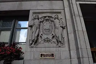 The main (east) County Building entrance features four additional high reliefs: a man studying a scroll; a man holding a sailing ship and fishing net; and two near-identical reliefs depicting an older version of the county seal flanked by two young men.[1]
