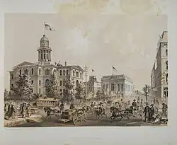 The first Chicago City Hall in 1837 was in leased chambers in the Saloon Building on the corner of Lake and Clark Streets.[11] The city next leased space in a building owned by Nancy Chapman, from 1842 until 1848, when Old Market Hall was constructed in LaSalle Street.[12] The city owned market hall held city council business on its second floor, with shops below until 1853. A new combined city hall and county courthouse was then constructed in the public square made by Randolph, LaSalle, Washington, and Clark Streets (this building, which later burned, is sometimes referred to as, Old Chicago Courthouse). President Abraham Lincoln's body lay in state at the old courthouse city hall prior to his burial in Springfield in 1865.[11] The courthouse bell was rung in 1871 to raise the alarm during the Great Chicago Fire before the hall burned to the ground.[14]