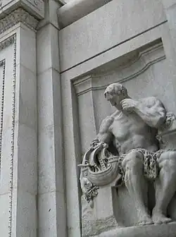 The main (west) City Hall entrance features four reliefs sculpted by John Flanagan.[19] Each of the panels represents one of four principal concerns of city government: playgrounds, schools, parks, and water supply.[19]