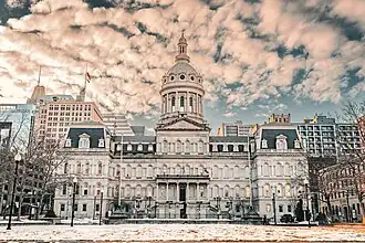 Baltimore City Hall is the official seat of government of the City of Baltimore, in the State of Maryland. The City Hall houses the offices of the Mayor and those of the City Council of Baltimore. The building also hosts the city Comptroller, some various city departments, agencies and boards/commissions along with the historic chambers of the Baltimore City Council. Situated on a city block bounded by East Lexington Street on the north, Guilford Avenue (formerly North Street) on the west, East Fayette Street on the south and North Holliday Street with City Hall Plaza and the War Memorial Plaza to the east, the six-story structure was designed by the then 22-year-old new architect, George Aloysius Frederick (1842–1924) in the Second Empire style, a Baroque revival, with prominent Mansard roofs with richly-framed dormers, and two floors of a repeating Serlian window motif over an urbanely rusticated basement.[2][3]