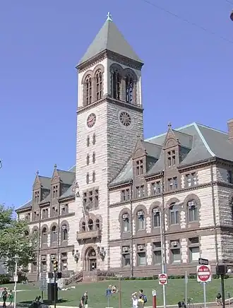 The Cambridge, Massachusetts City Hall is the city hall for Cambridge, Massachusetts, located at 795 Massachusetts Avenue, and built in the Richardsonian Romanesque style.[1] The building additionally serves as a centerpiece of the surrounding City Hall Historic District and adjacent Central Square Historic District.