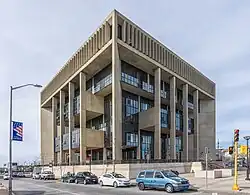 The main building is a concrete cube, approximately 144 feet (44 m) square,[4] with a smaller glass-enclosed cube forming the middle floors. The building is set atop an elevated "basement" containing mechanical and storage areas constructed atop the steel platform which spans the highway. The platform also includes South Main Street to the west and Second Street to the east, creating a 900-foot (274 m) long tunnel.
