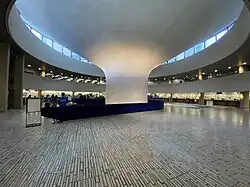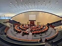The city council chambers is a semi-circular room located on the second floor supported by a single massive column below. On the main level of the chambers are the seats for the 25 members of Toronto City Council, arranged in a semi-circle.[44] To absorb sound, the chamber is carpeted and the ceiling is sound-dampened using carpet fibres. The ceiling weighs 2,000 tonnes (2,000 long tons; 2,200 short tons) of poured concrete. During construction, it took 40 days to dry.[44] The chamber is supported by a single column of concrete below, visible from the first floor of the podium.[44]