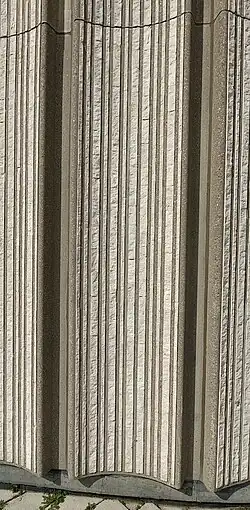In Revell's design, the outside walls of the towers were clad in precast concrete panels with 3/4-inch vertical strips of Botticino marble, intended to help the walls sparkle when floodlit. The panels cost CA$2.5 million in total, and the contract went to Toronto Cast Stone Co., which had to build a new machine to construct them.[43] The panels were also used as the formwork for the 18 inches (46 cm)-thick reinforced concrete structural walls of the towers.[43]