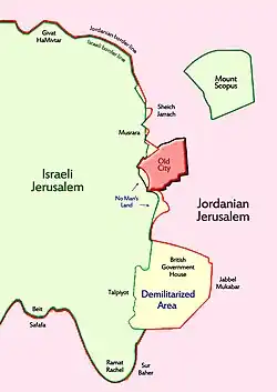 In Jerusalem, the "City Line" was a 7-kilometre (4.3 mi) segment of the Green Line that divided the city between Israel and Jordan as part of the 1949 Armistice Agreements, which ended the 1948 Arab–Israeli War. On one side was West Jerusalem, which was part of Israel, and on the other side was East Jerusalem, which was part of the Jordanian-annexed West Bank; East Jerusalem also included the Old City and the Israeli exclave of Mount Scopus. Additionally, a "Demilitarized Area" surrounding the British Government House was controlled by the United Nations. The City Line had numerous fortifications and obstacles on both sides, and various buildings in the city that were situated along the boundary were used as military posts. This arrangement was in place until the 1967 Arab–Israeli War, when Israel captured the entirety of Jerusalem. In 1988, six years before the Israel–Jordan peace treaty, the Jordanian government formally renounced the country's territorial claim to Jerusalem in favour of supporting the establishment of a Palestinian state, though the Jordanian Waqf continues to exercise authority over the Al-Aqsa Mosque compound in the Old City. Pursuant to the two-state solution laid out by the Oslo Accords, East Jerusalem has been sought by the Palestine Liberation Organization as the capital city of the State of Palestine.