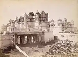 The earliest royal structure he built here was the Royal courtyard or 'Rai Angan',[11][12][13] which was the beginning of the building of the City Palace complex. The court was built at the location where the hermit had advised Maharana to build his new capital.[10][11][12][13][14]