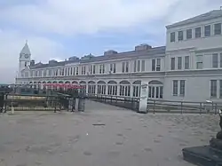 The eastern or inshore end of Pier A was constructed in 1900 as a square two-story annex, which was expanded to three stories in 1904.[19][20] It extends about 50 ft (15 m) inland.[6][20] The inshore annex's facade is divided vertically into three bays each on its northern, eastern, and southern elevations.[19] The bays are divided by one-story pilasters, and a cornice runs above the third story.[20] The eastern elevation includes a large archway on the ground floor (originally used by horse-drawn carriages), which is flanked by smaller openings with architraves. On the second and third stories of the eastern elevation, there is a triple window in the center bay and a single window on either side.[19] Above the third story, the center bay contains a triangular pediment with seashell decorations, originally decorated with the letter "A".[6][19][20] On the northern and southern elevations, the inshore annex has a double window in each bay, as well as a segmentally arched pediment at the center above the third story. The inshore annex is topped by a gable roof.[20]