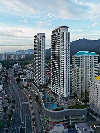 City Residence is a mixed-use complex within George Town in the Malaysian state of Penang. Located at the suburb of Tanjong Tokong, the development consists of twin residential towers and a three-storey shopping mall named City Junction that forms the podium. Built by local developer Ivory Properties Group, each tower is designed as a low-density residence comprising only 101 units spread across 39 storeys, integrated with recreational and communal amenities.[3][4]