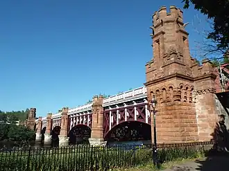 In 1898 the bridge was completely rebuilt, and widened for quadruple track; compressed air excavation for 13-foot (4 m) diameter steel piers were used. The structure consists of two variable depth continuous girders. The visible spandrel braced arches are not primary structural members. There is a decorative cast-iron cornice and parapet, and towers and half turrets in red sandstone. The work cost £67,970.[2] The engineer was William Melville, this time for the Glasgow & South Western Railway Company, and the contractors were Morrison and Mason for the foundations, and Sir William Arrol & Co. for the steelwork.[3] It is a listed building, category B.[4]