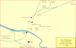 Other unsuccessful proposals followed, but in 1863 a prospectus for a City of Glasgow Union Railway was published: it would "unite the whole of the Railways now terminating North and South of the River Clyde", and provide a "general Central Station" (at St Enoch Square) for passengers and a separate "General Goods Station" on lands to be vacated by the University of Glasgow: "College Goods station". The promoters were contractors, hoping to generate construction work for themselves, and they wished to involve all the railways in the scheme, taking a substantial block of shares themselves.[note 1] The G&SWR and the Edinburgh and Glasgow Railway (E&GR) were favourable towards such a scheme as the trade in goods between their areas of influence was considerable, and the available through route was circuitous. The other major player was the Caledonian Railway (CR) which had terminals north and south of the Clyde; it was developing its Buchanan Street station and it had adequate goods facilities, but it was not opposed to the idea of a link and a common passenger terminal.[1][2][3]