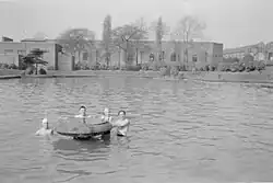 The Nottingham Corporation Act 1938 (1 & 2 Geo. 6. c. xcv) authorised the construction of two new pumping station, three new reservoirs, a water tower and trunk mains.[19] The whole of the works was estimated to cost £400,000 and was scheduled for completion by 1948, but the project was interrupted by World War II. Between 1945 and 1969, with revised plans five further electrically-powered borehole stations were built at Rufford, completed in 1945, Lambley, built in 1957, Halam, operational by 1963, Markham Clinton, opened in 1965, and finally Ompton, which was finished in 1969.[3] By 1969, 23 million imperial gallons (100 Ml) of water were supplied daily from boreholes and pumping stations abstracting water from the Bunter sandstone.[5]