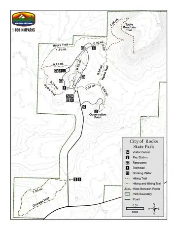 The City of Rocks State Park is also home to three main hiking trails: the Hydra trail, the Table Mountain trail, and the newly added Cienega Trail.[14] The Hydra trail is 3.3 miles long with an elevation gain of 164 ft.[15] The Table Mountain trail is 3 miles long with an elevation gain of 695 ft.[16] The Cienega trail is about 2 miles, making it the shortest.