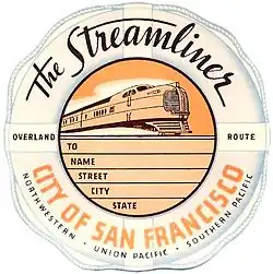 The City of San Francisco was a streamlined through passenger train which ran from 1936 to 1971 on the Overland Route between Chicago, Illinois and Oakland, California, with a ferry or bus connection on to San Francisco. It was owned and operated jointly by the Chicago and North Western Railway (1936–55), Chicago, Milwaukee, St. Paul and Pacific Railroad (1955–71), the Union Pacific Railroad, and the Southern Pacific Railroad. It provided premium extra fare service from Chicago to San Francisco when introduced in 1936 with a running time of 39 hours and 45 minutes each way.