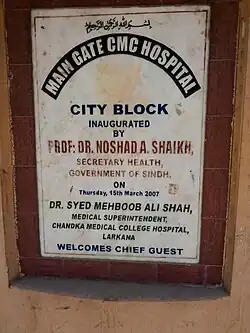 The cornerstone of this 100-bed hospital was laid by Khawaja Nizamuddin, Governor-General of Pakistan on February 1, 1951. The hospital was completed three years later, in 1954.[3] Nawab Amir Ali Lahori provided land for the hospital. It was the first custom-built civil hospital in Larkana. Prior to the establishment of the hospital, the girls' school building on Baker Road was relocated in 1909 from Shikarpour (Sind) and was used as Larkana Civil Hospital.[4]
