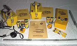 The Civil Defense CD V-717 with detachable ionization chamber deployed. Ionization chamber portion sits atop yellow anti-contamination bag.