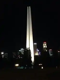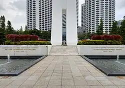 The Memorial to the Civilian Victims of the Japanese Occupation, usually called the Civilian War Memorial (Chinese: 日本占领时期死难人民纪念碑; Malay: Tugu Peringatan Bagi Mangsa Awam Pemerintahan Jepun; Tamil: ஜப்பானியர் ஆதிக்க காலத்தில் உயிர் துறந்த பொதுமக்களுக்கன நினைவுச் சின்னம்), is a war memorial and heritage landmark in Singapore next to Esplanade MRT station. It was built in memory of the civilians killed during the Japanese occupation of Singapore during World War II. The Civilian War Memorial sits on serene parkland in the midst of busy city traffic near Singapore's Padang and City Hall. Located within the War Memorial Park at Beach Road within the Central Area, Singapore's central business district, it is usually easy to spot in most backdrops encompassing the CBD landscape. It was gazetted as the 65th national memorial on 15 August 2013.