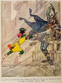 A similar Irish tale involving the "external soul" is the Donegal tale "Hung up Naked Man"[111] or "The Bare-stripping Hangman"[112] studied at length by Roger Sherman Loomis (1927). While Loomis does not explicitly state a connection to the sword of light, he remarks that there is parallel to the Irish giant Cú roí,[113] whose death-tale Aided Chon Roí is of the external soul type, involving the destruction of a golden apple or ball to kill him, as revealed by Cú roí's abducted and forced wife Blaíthíne,[114][115] and Loomis describes Cú roí a "solar host" or "solar divinity",[116] noting further that Cú roí could only be "slain with his own sword".[117] In T. F. O'Rahilly's conception (cf. § As a mythological sword below), this Cú roí is just one of the names of the Otherworldly God (often a sun god), to be opposed by the Divine Hero (most prominently Cúchulainn) who carries, in later story-telling, the "Claidheamh soluis of [Ireland's] halfpenny postage-stamps" (cf. top image).[118]