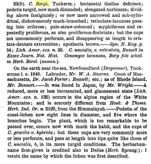 - ^ "Fishnet Cladonia (Cladonia boryi)". LichenPortal. Retrieved 2021-12-04.
