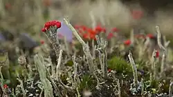 Ecologically, C. floerkeana demonstrates a high reproductive effort, producing abundant apothecia on its podetia, which die after spore release. This strategy facilitates its rapid colonisation of new substrates.[17] Although tolerant of extreme conditions, the species remains relatively rare in geothermal vent systems, likely due to its specific habitat requirements and interactions with environmental factors such as soil texture and moisture.[19] The structure of its podetia, particularly the fibrous medullary layer that persists after secondary squamules shed, may provide structural support and resilience to environmental stressors, further enhancing its ability to thrive in disturbed or extreme habitats.[13] Its slow growth rate (about 0.8 mm per year) further reflects its classification as a stress-tolerant organism, adapted to persist in nutrient-poor and disturbed environments.[20] The species relies on a heterothallic breeding system, requiring genetically distinct partners for sexual reproduction, which promotes genetic diversity and enhances its adaptability to harsh environments.[17]