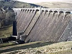 The Claerwen reservoir and dam in Powys, Wales, were the last additions to the Elan Valley Reservoirs system built to provide water for the increasing water demand of the city of Birmingham and the West Midlands. The dam is built mainly of concrete, with the exterior dam face in dressed stone. The dam is a gravity dam built upon solid rock foundations as the pressure of the reservoir behind should be in equilibrium with the total weight of the dam itself thus causing complete stability.