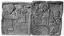 Beside the textual sources, the legend of the Bagratids' Davidic origin is possibly enshrined in the stone effigy in low relief from the medieval Georgian monastery of Opiza, in Shavsheti, and now on display at the Art Museum of Georgia in Tbilisi. The sculpture represents a nobleman in an act of offering a church model to Jesus Christ, seated upon a throne, blessing the donor, and accompanied by a man with his hands in a gesture of supplication. Based on the accompanying minimal Georgian inscriptions, the relief is traditionally interpreted by Ekvtime Taqaishvili, Ivane Javakhishvili, and Cyril Toumanoff as a contemporary depiction of the curopalates Ashot I (died 830) with Christ and the biblical King David. Toumanoff, for example, was convinced that here "the allusion to the donor's descent from Our Lord's ancestor and the latter's intercession is unmistakable".[4] A more recent interpretation by the likes as Nodar Shoshiashvili and Wachtang Djobadze, however, suggests identification of the persons in question as a later curopalates Ashot (died 954) and this Ashot's elder brother David (died 937).[29][30]
