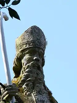 According to the traditional account, Clair was sent to Nantes by Pope Linus, the successor of Peter, seventy years after the birth of Christ.[3] He arrived from Rome, with a nail in his possession from the cross that bore the martyrdom of Peter. Then he built an oratory dedicated to the apostle, which would later become Nantes Cathedral.[4] He died in Kerbellec, village commune Réguiny (Morbihan), and his tomb (emptied since the Norman invasions in late 9th century) lies in a chapel adjoining the church of Réguiny. A votive fountain is also located on the territory of the Breton town.