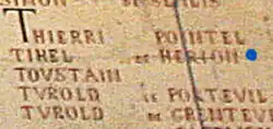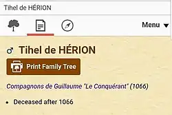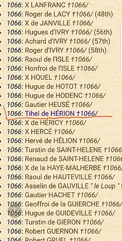The name Heron is from the name de Herion, a habitational name from Heron near Rouen in Normandy. The progenitor of the clan, Tihel de Herion, was a Norman who arrived in England with William the Conqueror in 1066 and is found on the Battle Abbey Roll and the Falaise Roll. His name is on the stone plaque at dive-sur-mer and inscripted "Tihel de Hérion" He was granted land in Essex and his descendants spread to Northumberland, Hertfordshire, Scotland and Ireland. He also left descendants in France before residing in England.