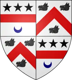 - Arms: Quarterly, 1st & 4th, Argent, a fess Gules between three mullets in chief Sable and a crescent in base Azure; 2nd & 3rd, Argent, a chevron between three boars' heads couped Sable.