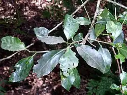 Leaves are alternate, simple and toothed in an irregular manner. They are oblong or elliptical in shape, 5 to 12 cm long with a blunt leaf tip. Leaf stalks are 1 to 4 cm long. There are usually two small glands at the apex. The midrib is paler than the leaf itself, and venation is more evident under the leaf.